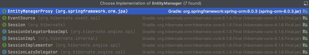 위 사진들은 Hibernate가 어떻게 JPA를 구현하고 있는지를 보여줍니다. JPA에서 봤던 EntityManager를 Hibernate는 Session을 통해 구현하고 있는 것을 볼 수 있죠.