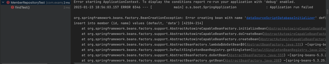 org.springframework.beans.factory.BeanCreationException: Error creating bean with name 'dataSourceScriptDatabaseInitializer' defined in class path resource [org/springframework/boot/autoconfigure/sql/init/DataSourceInitializationConfiguration.class]: Invocation of init method failed; nested exception is org.springframework.jdbc.datasource.init.ScriptStatementFailedException: Failed to execute SQL script statement #1 of URL [file:/Users/jinho/Desktop/jinho/study/spring/dbtest/out/production/resources/data.sql]: insert into member (id, name) values (default, 'test');