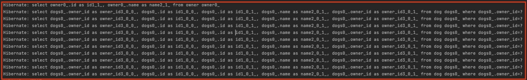 위에서 예시로 들었던 것처럼 (Owner를 조회하는 쿼리 1) + (Dog를 조회하는 쿼리 10) = 11로 총 11번의 쿼리가 실행된 것을 볼 수 있습니다.