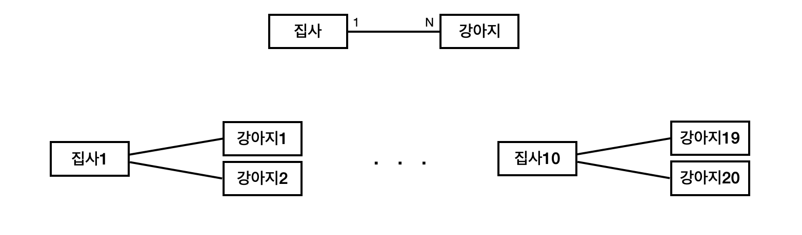 간단한 예시로 다음과 같이 집사와 강아지가 일대다 관계에 놓여있다고 가정을 해보겠습니다.