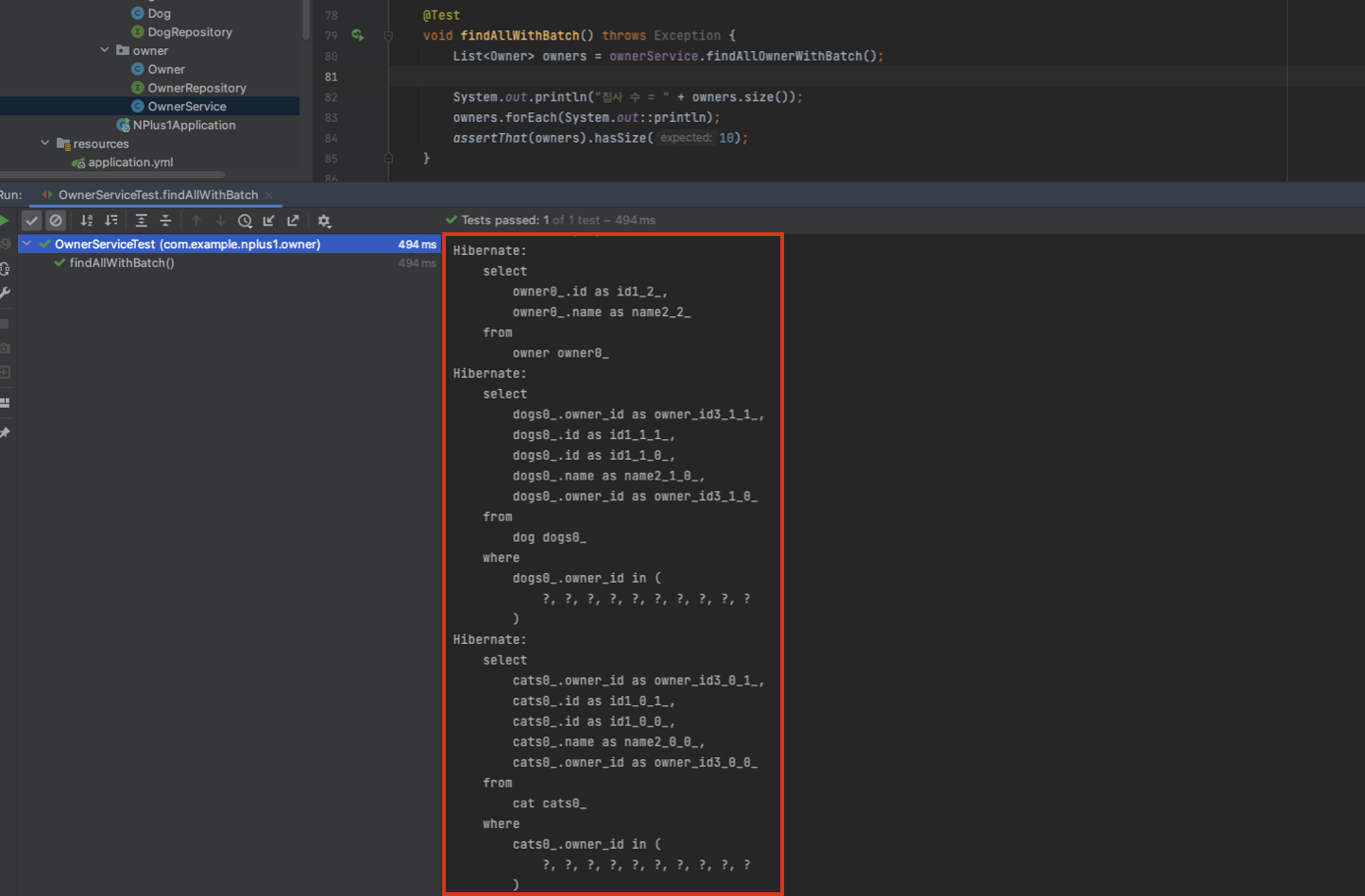 기존 N + 1의 경우였다면 (Owner를 조회하는 쿼리 1) + (Dog를 조회하는 쿼리 10) + (Cat을 조회하는 쿼리 10) = 21으로 21번의 쿼리가 생겨야 하는 반면, Batch를 설정하게 되면 (Owner를 조회하는 쿼리 1) + (Dog를 조회하는 쿼리 1) + (Cat을 조회하는 쿼리 1) = 3으로 총 3번의 쿼리만 생성됩니다.