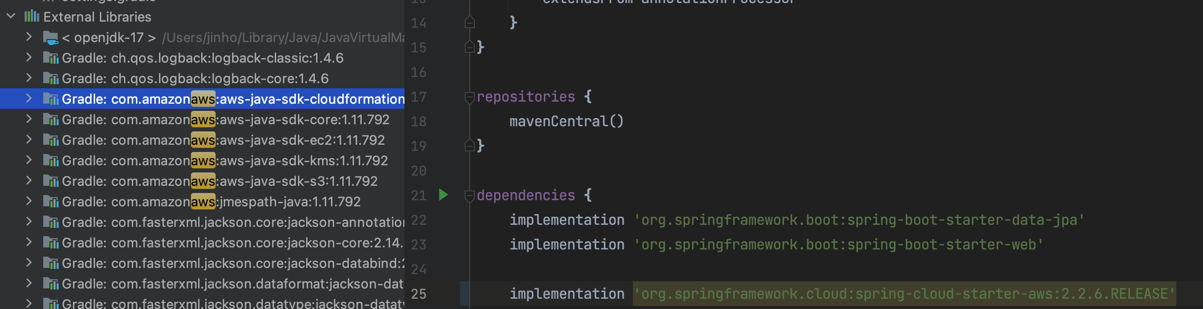 그런데 의존성을 추가해도 S3 연결에 필요한 AmazonS3Client 객체를 import 할 수 없었고, External Libraries를 살펴봐도 aws에 관한 sdk가 추가되지 않았었습니다.