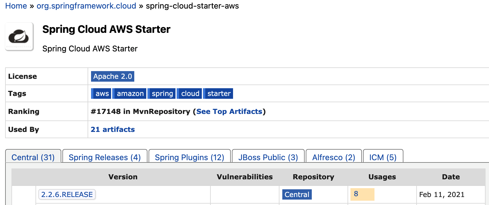 https://mvnrepository.com/artifact/org.springframework.cloud/spring-cloud-starter-aws/2.2.6.RELEASE