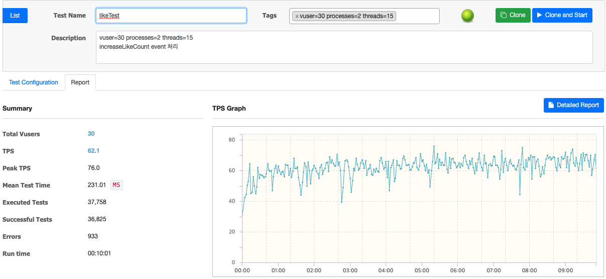 vuser를 30명으로 두고 테스트를 했을 때 TPS가 53, MTT가 357ms 정도가 나왔고, 로컬 환경에서 테스트를 돌렸기 때문에 높은 퍼포먼스를 기대할 수 없는 것을 감안해도 아주 낮은 성능을 보이는 것을 짐작할 수 있었습니다.