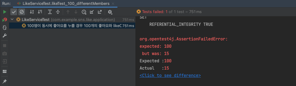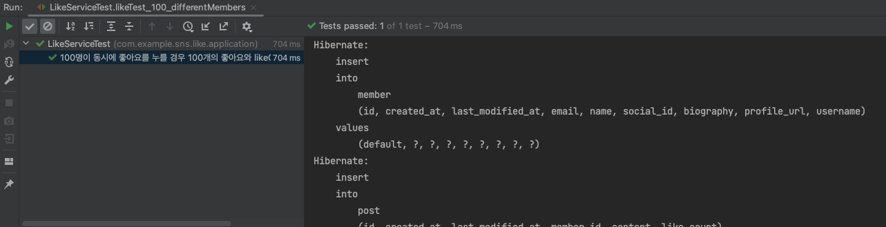 @DisplayName("100명이 동시에 좋아요를 누를 경우 100개의 좋아요와 likeCount가 100개 올라야 함")