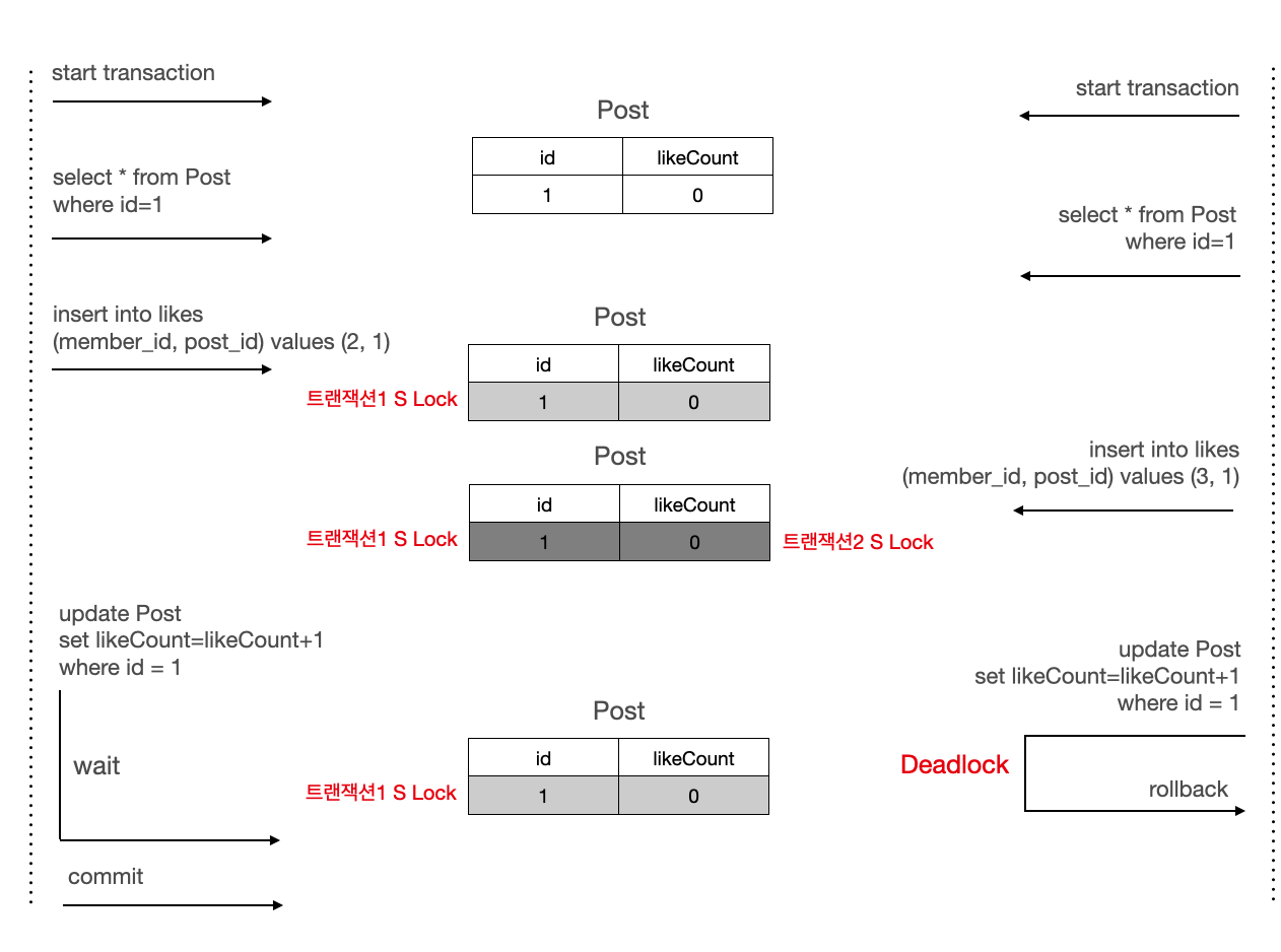 그림처럼 서로 다른 트랜잭션이 동시에 likes 테이블에 같은 post를 foreign key로 하는 데이터를 insert 할 경우, 해당 post에 두 개의 공유 락이 걸리게 됩니다.