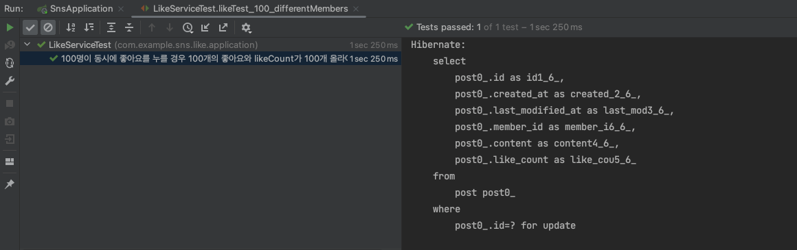 역시나 기대했던 대로 테스트를 통과한 것과, post를 조회할 때 for update가 마지막에 붙은 쿼리가 작성되는 것을 확인할 수 있었습니다.
