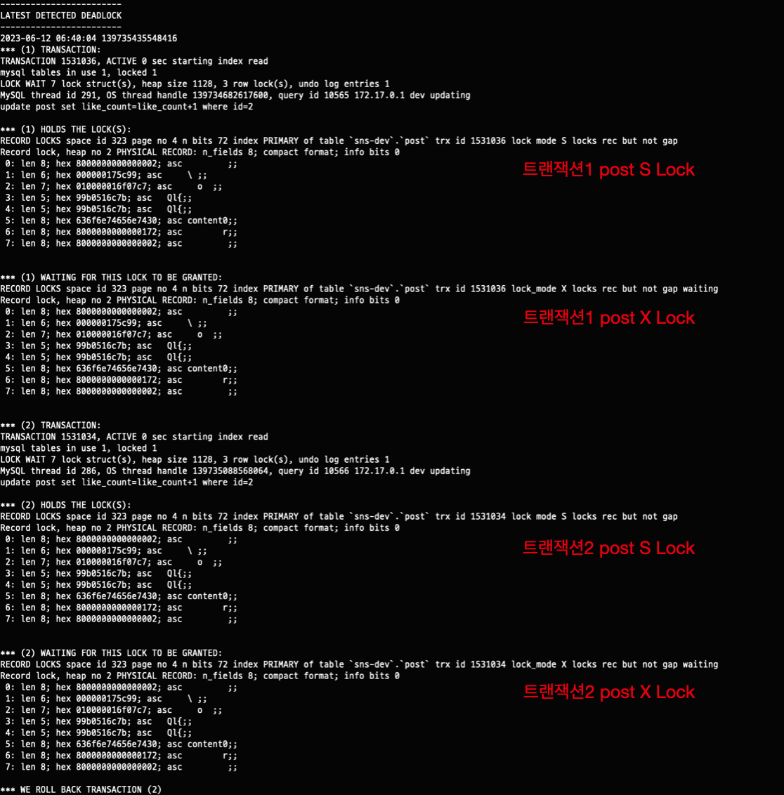 다시 말하면, 다른 트랜잭션에서 공유 락을 걸어둔 post 레코드에 대해 update를 하기 때문에 데드락이 생기는 것이죠.