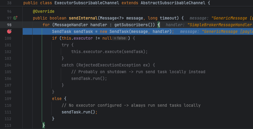 handler에는 config 설정에 따라 SimpleBrokerMessageHandler와 UserDestinationMessageHandler가 존재하는데, 특정 유저에게 메시지를 보내는 부분을 보기 위해서는 UserDestinationMessageHandler를 봐야 합니다.